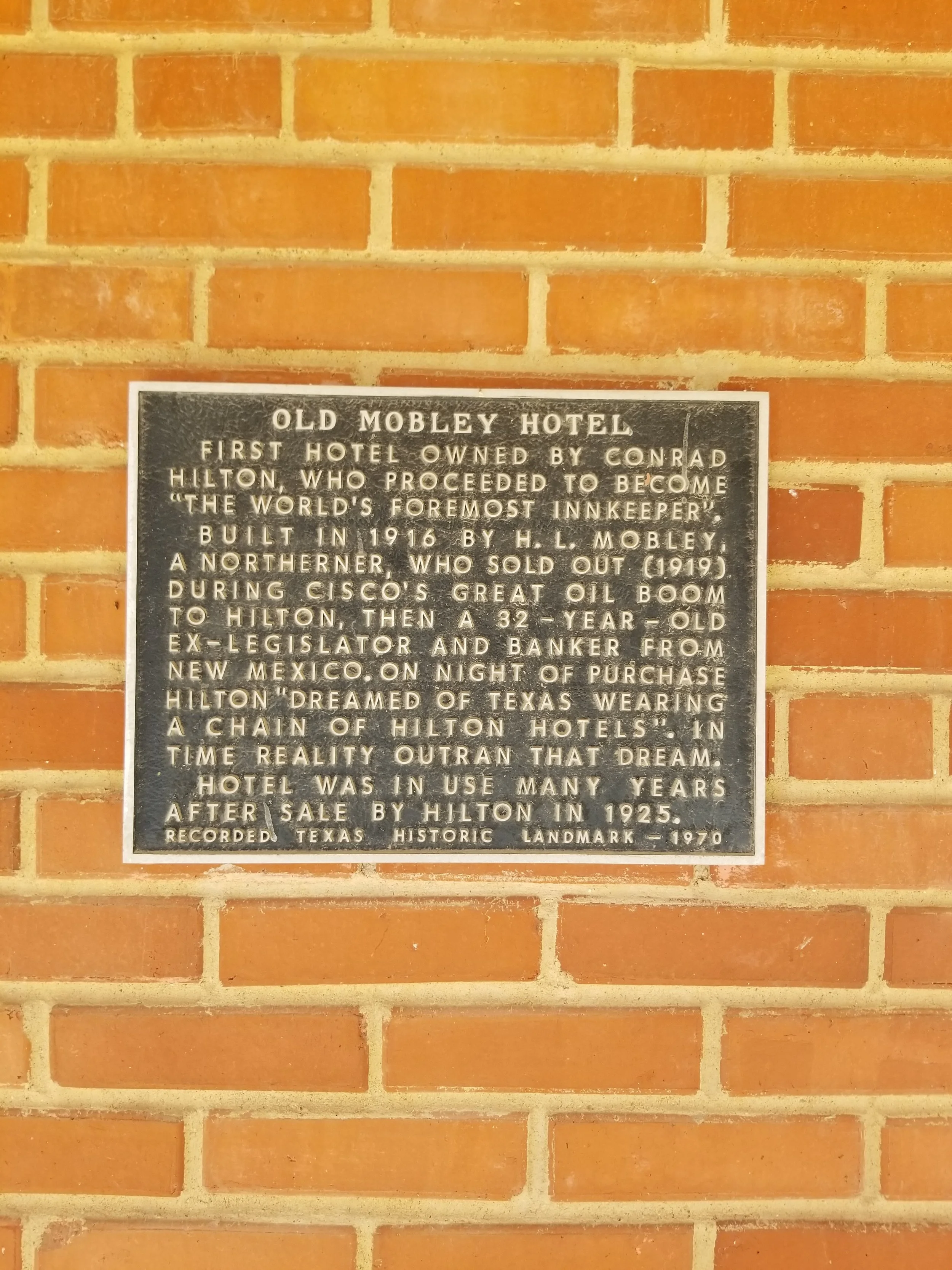 I walked up to the door and the museum appeared to be closed. Luckily, there was a small pamphlet taped to the door and a series of placards placed around the property that filled me in on the history of the town. I had no idea that Conrad Hilton’s first hotel was a small two-story, 40 bed, brick building in the middle of Texas -- charmingly called, “The Mobley”.