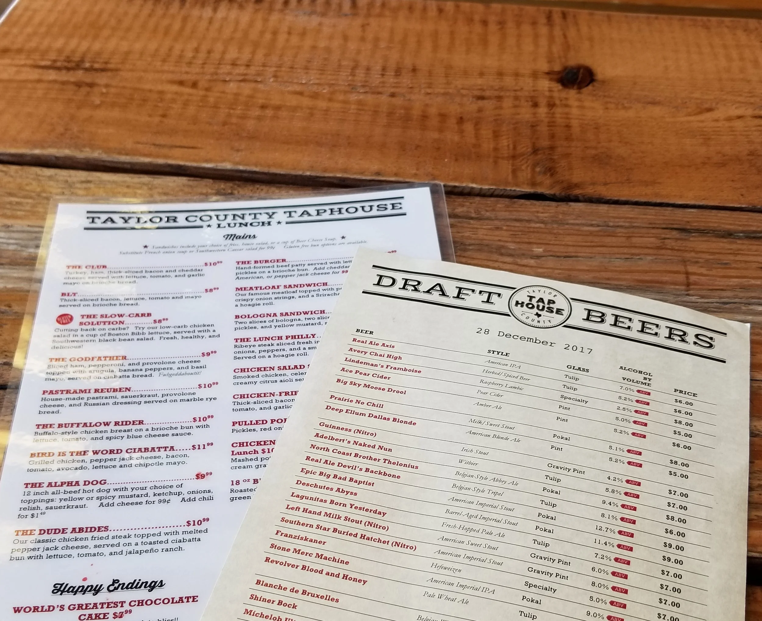 Since I have my best travel buddy with me - my 10 year old Westie (Brody) I googled for a restaurant that had a decent patio for him to lounge around while I eat. I chose Taylor County Taphouse. I like a good local brewpub. If I had another driver I’d of tasted those local beers on the menu, but I settled for simple iced tea. The restaurant was a single turn off of a busy strip-mall ridden road and was easy to find. I loved the huge flags out front - a perfect photo-op for a “drive across Texas” kind of day.