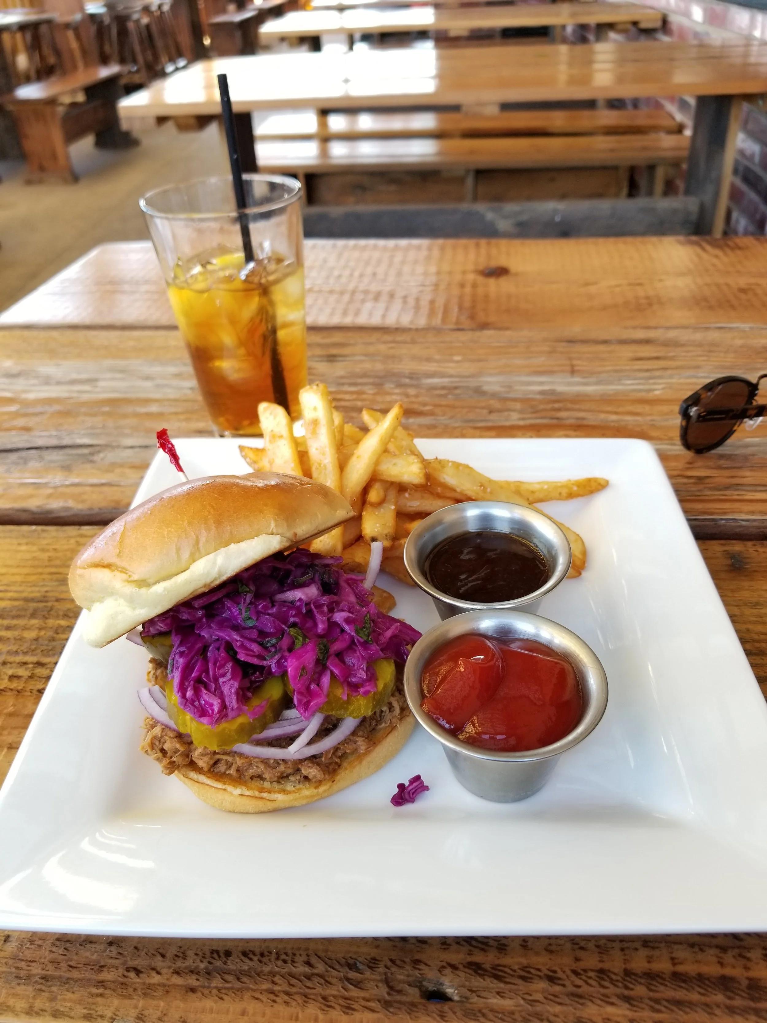 Eventually I was able to place my order. They had typical bar fare on the menu - burgers, BBQ, and beer. I got a pulled-pork sandwich. The sandwich was good, but it looked prettier than it tasted. A neighboring table ordered some giant hotdog concoction that looked amazing. If I’m ever here again I’d give this place another try for sure.
