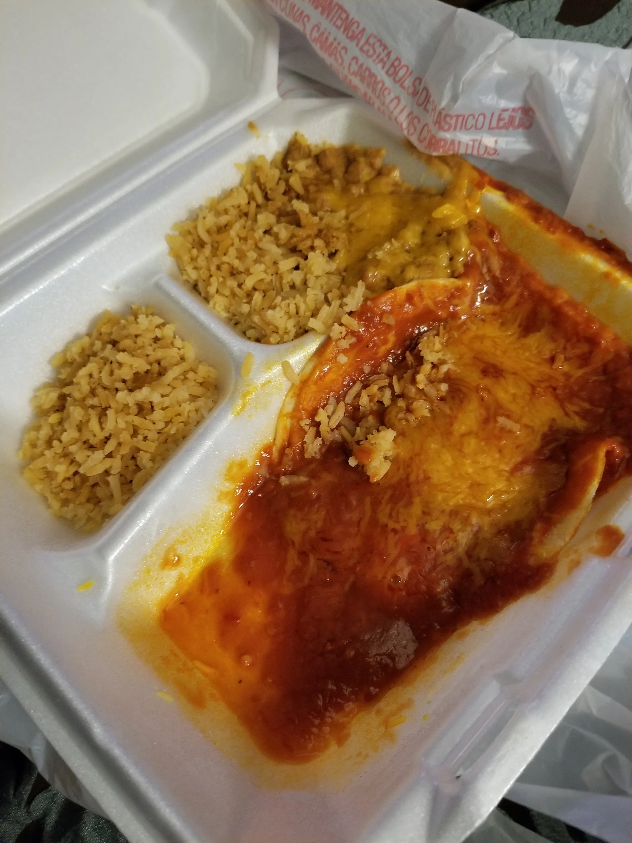 The peach colored house-like restaurant with a bright red door opened into a checkered floor dining room that wrapped around a corner. The walls were covered in felt bedazzled sombreros and classic New Mexican chilli bundles. Little diner tables were placed throughout. The waitress met me near the front. I told her I was getting an order to go (I didn’t want to be the jackass that makes the staff serve past closing) and she set me up with a menu. I went with the child’s red sauce enchiladas (2 enchiladas, refried beans, and mexican rice -- I guess meant for a big child). I topped it off with a Mexican coke in a bottle.